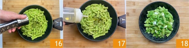 Misture bem e, por fim, adicione uma pitada de pimenta 16 e um fio de azeite 17. Sirva sua massa decorando com as ervilhas e um pouco de Stracchino 18.