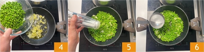 Adicione as ervilhas 4, tempere com sal 5 e acrescente um par de conchas da água destinada ao cozimento da massa 6.