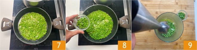 Deixe cozinhar por cerca de 10 minutos 7. Após esse tempo, cozinhe os fusilli na água que já terá atingido o ponto de ebulição. Separe um pouco das ervilhas para a montagem final e transfira as outras para um copo alto e estreito. Bata as ervilhas com um mixer de imersão 9.