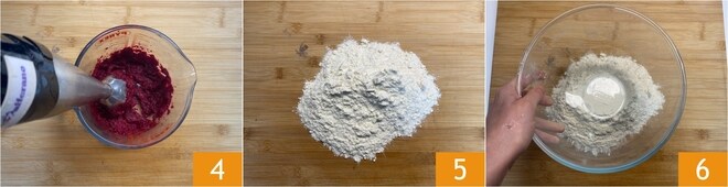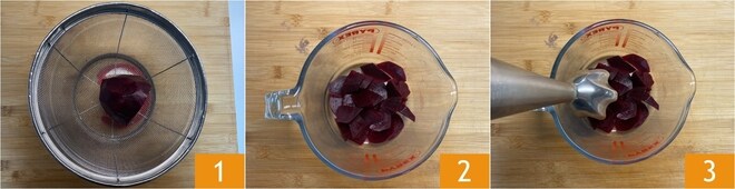 Para preparar a massa fresca com beterraba, escorra a beterraba pré-cozida para eliminar quaisquer líquidos 1. Reduza-a em pedaços e coloque em um copo 2, triture finamente com um mixer de imersão 3.