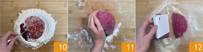 Use um garfo para começar a misturar os ingredientes inicialmente sem pegar mais farinha 10, depois comece gradativamente a juntar cada vez mais farinha e quando a massa estiver suficientemente seca, continue com as mãos e trabalhe até ficar lisa e homogênea, cuidando para não rasgar, para não estragar a rede de glúten. Se necessário, adicione mais farinha conforme necessário. Depois de obter uma bola 11, cubra-a e deixe descansar por pelo menos 30 minutos. Com o raspador, corte metade da massa 12. (Você pode manter a outra metade coberta com filme plástico para que não resseque).