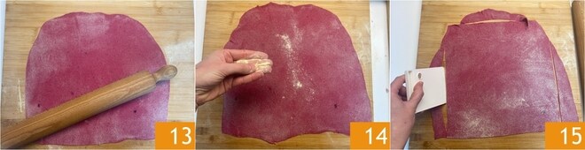 Você pode abrir com o rolo ou com a máquina de massa para fazer os formatos que preferir. Nós preparamos talharins, abrindo com o rolo sobre uma bancada polvilhada com sêmola (ou levemente enfarinhada). Estique a massa o mais fino possível 13, se usar a máquina de abrir massa, vá até a penúltima espessura, polvilhe com sêmola 14 e deixe secar por alguns minutos. Acertar as bordas para criar um retângulo 15.