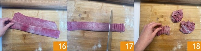 Enrole a massa 16, corte rolinhos de cerca de 7 mm 17 e forme os clássicos ninhos 18.