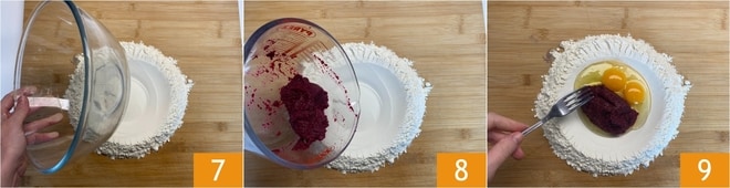 Uma vez criado o espaço 7, despeje no interior o purê de beterraba 8 e os dois ovos 9.
