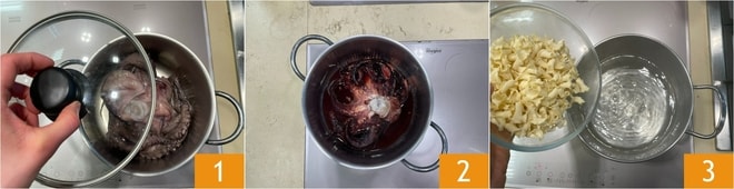 Para preparar a massa fria com polvo, a primeira coisa a fazer é colocar o polvo em uma panela para cozinhar "a seco": o polvo vai cozinhar na própria água. Cubra com uma tampa 1 e deixe cozinhar em fogo médio-baixo por 20-30 minutos 2, depois deixe esfriar na panela. Enquanto isso, cozinhe a massa 3 e assim que estiver pronta, escorra, transfira para uma tigela, tempere com um fio de azeite e deixe esfriar.