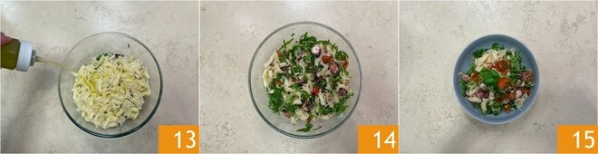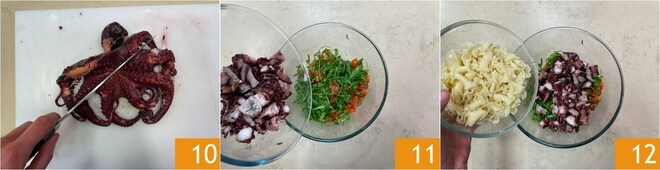 Assim que o polvo estiver frio, corte-o em pedaços 10, se preferir, você pode remover um pouco da pele esfregando com papel toalha. Coloque o polvo na tigela com a rúcula e os tomates 11, depois adicione a massa que já estará fria 12.