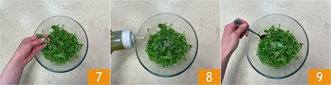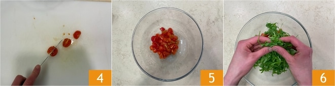 Lave os tomatinhos e corte-os em 4, ou ao meio se forem pequenos 4. Transfira-os para uma tigela grande 5 e adicione também a rúcula, rasgando-a com as mãos 6.