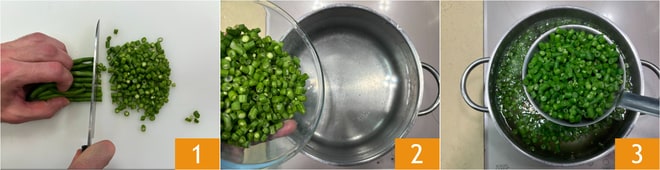 Para preparar a massa fria com ricota, abacate e vagens, primeiro corte as vagens em pedacinhos 1 e escalde-os em água salgada 2. Escorra-os 3 e reserve a água de cozimento.