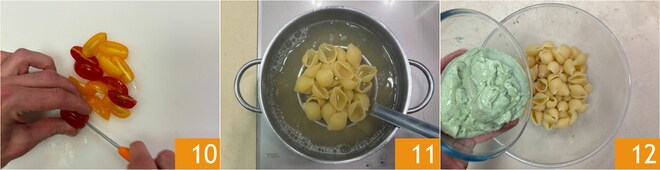 Corte os tomatinhos 10. Escorra a massa 11 e transfira-a para uma tigela grande. Adicione o creme de ricota e abacate 12.