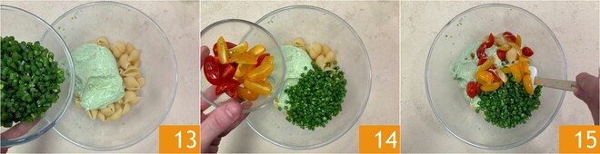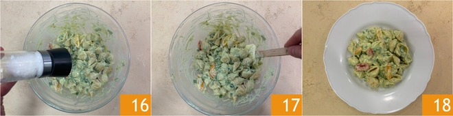 Despeje um fio de azeite, ajuste o sal e a pimenta 16 e dê uma última mexida 17. Sua massa fria com ricota, abacate e vagens está pronta para ser saboreada 18!