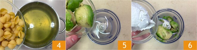 Mergulhe a massa na água de cozimento das vagens e cozinhe ao dente 4. Enquanto isso, em um mixer, coloque o abacate 5 e a ricota 6.