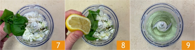 Adicione também o manjericão 7, o suco de limão 8, uma pitada de sal e bata até obter um creme liso e homogêneo 9.