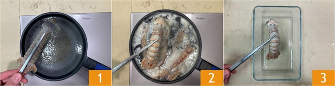 Para preparar a massa mista com tamarutacas e rabos de camarão, comece cozinhando as tamarutacas: escalde as galeras inteiras em água por cerca de 20 segundos 1, depois escorra 2 e transfira para uma tigela 3.