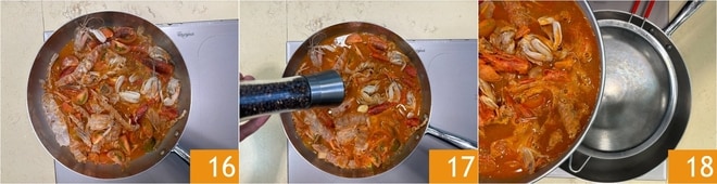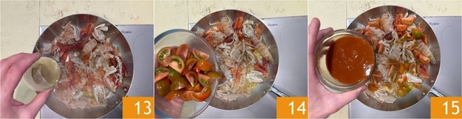 Refogue por alguns instantes, depois adicione o vinho branco 13 e deixe evaporar o álcool. Neste ponto, adicione os tomates e o molho de tomate 15.