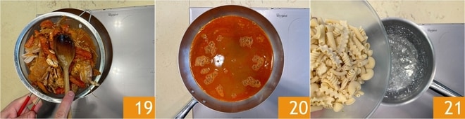 Esprema bem os resíduos para extrair os sucos 19. Reserve o fundo obtido 20 e, enquanto isso, cozinhe a massa por metade do tempo de cozimento indicado na embalagem 21.