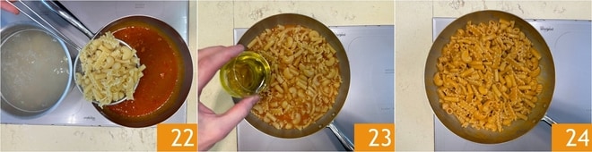 Escorra a massa na metade do tempo diretamente na frigideira com o fundo coado 22. Complete o cozimento, finalmente misture com o azeite de oliva 23 e mexa para incorporar 24.