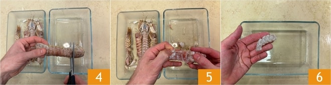 Separe a cabeça 4 e retire a casca da carne 5; reserve as galeras descascadas 6 e guarde os resíduos.