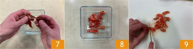 Descasque também os camarões: retire a cabeça 7, elimine a casca e o intestino nas costas 8, depois divida a carne ao meio 9.