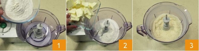 Para preparar a massa podre de cacau, coloque em um processador a farinha peneirada 1 e a manteiga fria cortada em cubos 2. Bata tudo até obter uma mistura arenosa e farinácea 3.