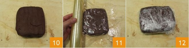 Sove até obter uma massa macia, neste ponto forme um bloco 10, envolva com filme plástico para alimentos (11-12). Deixe descansar na geladeira por pelo menos meia hora antes de usá-lo para fazer biscoitos ou tortas.