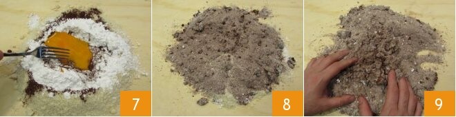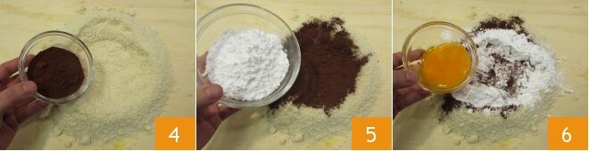 Depois transfira para uma superfície enfarinhada. Forme a clássica montanha, em seguida, adicione ao centro o cacau em pó peneirado 4, o açúcar de confeiteiro 5 e as 3 gemas 6.