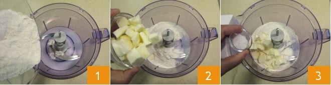 Para preparar a massa podre salgada, coloque a farinha em um processador com lâminas de aço 1, depois adicione a manteiga gelada da geladeira 2 e o sal grosso 3