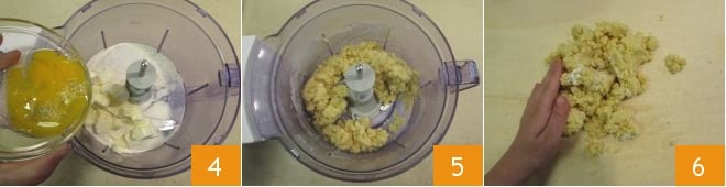 e o ovo 4. Feche com a tampa e ligue o processador até obter uma mistura esfarelada 5. Transfira a mistura para uma superfície e trabalhe rapidamente com as mãos 6