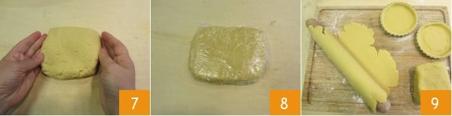 para formar um bloco 7. Enrole o bloco em filme plástico 8 e deixe descansar na geladeira por pelo menos uma hora. Após esse tempo, você pode abrir sua massa podre salgada em uma superfície levemente enfarinhada para fazer uma torta ou tortinhas 9!