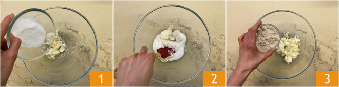 Para preparar a massa podre vegana, comece batendo em uma tigela a manteiga vegana e o açúcar 1, amoleça bem 2 e então adicione a farinha tipo 1 3.