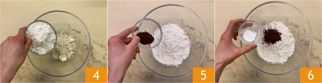 Junte também a farinha de castanha 4, o cacau 5, uma pitada de sal e o fermento em pó para bolos 6.