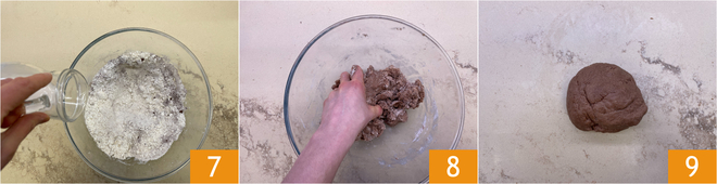 Dê uma rápida misturada e depois despeje a bebida de aveia 7, amasse à mão até a massa mudar de consistência 8. Trabalhe brevemente a massa na bancada e forme um disco 9, embrulhe em filme plástico, coloque na geladeira e depois de uma hora sua massa podre vegana estará pronta para ser usada.