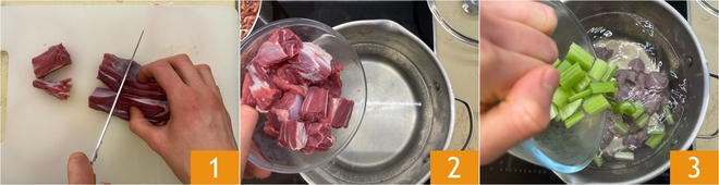 Para preparar a massinha em caldo de carne, primeiro corte a carne em pedaços 1 e faça o mesmo com os legumes. Coloque a carne em uma panela grande com bastante água fria 2, depois adicione o aipo 3.