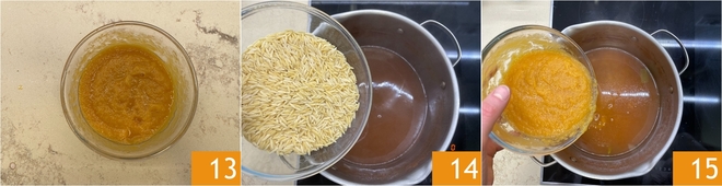 Você deve obter um creme liso e aveludado 13. Se o caldo estiver muito abundante, você pode remover uma parte, depois despeje a massinha diretamente na panela após fervê-lo 14 e cozinhe pelo tempo indicado na embalagem. Próximo ao final do cozimento, adicione o creme de legumes 15.