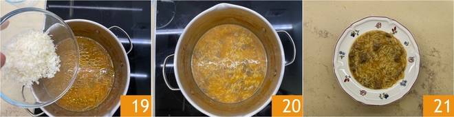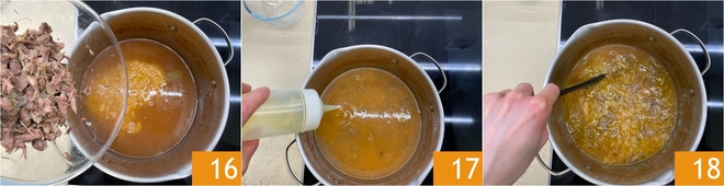 Adicione também a carne desfiada 16 e misture tudo. Com o fogo desligado, complete com um fio de óleo 17 e misture bem 18, ajustando a consistência com mais caldo, se desejar.