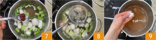 Complete com o extrato de tomate 7, que dará ao caldo uma cor quente e um sabor mais arredondado. Leve à fervura e cozinhe a partir desse momento por cerca de 2 horas, ou até a carne ficar macia. Durante o cozimento, remova com uma espumadeira a espuma que sobe à superfície 8: é uma etapa importante para obter um caldo mais claro, delicado e digerível. Apenas na última meia hora ajuste o sal 9, assim o sabor permanecerá equilibrado e você não corre o risco de obter uma sopa muito salgada.
