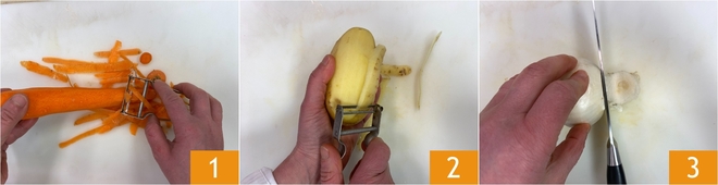 Para preparar a massinha no caldo, comece limpando a cenoura 1, a batata 2, a cebola 3 e o aipo.