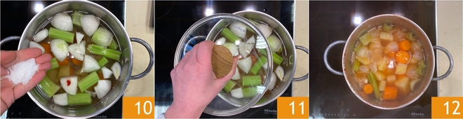 Ajuste o sal 10, então acenda em fogo médio, cubra com a tampa 11 e deixe ferver suavemente por cerca de 30 minutos, até que os legumes estejam macios 12.