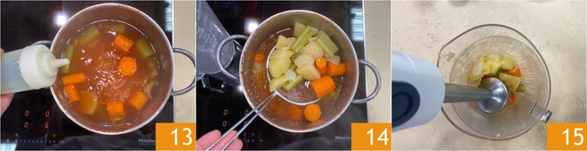 Após o tempo de cozimento, adicione um fio de óleo 13, depois escorra os legumes 14 e transfira-os para um recipiente. Bata com um mixer de imersão 15.
