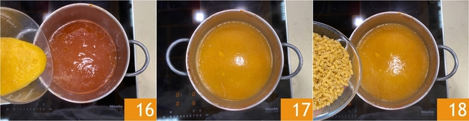 Despeje novamente o creme de legumes no caldo 16 e aqueça até que volte a ferver. Em seguida, adicione a massinha 18.