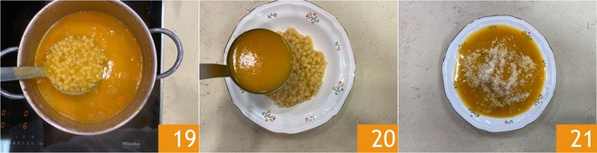 Cozinhe a massinha pelo tempo indicado na embalagem, mexendo de vez em quando para evitar que grude no fundo 19. Se necessário, você pode adicionar um pouco de água quente para ajustar a densidade. Uma vez pronta, sirva a massinha no caldo bem quente 20, completando cada prato com um fio de azeite extravirgem, Parmigiano Reggiano ralado e uma pitada de pimenta-do-reino a gosto 21!