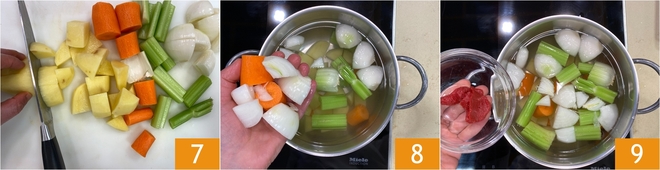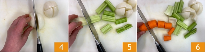 Lave os legumes em água corrente e corte em pedaços grosseiros a cebola 4, o aipo 5 e a cenoura 6.