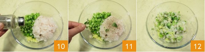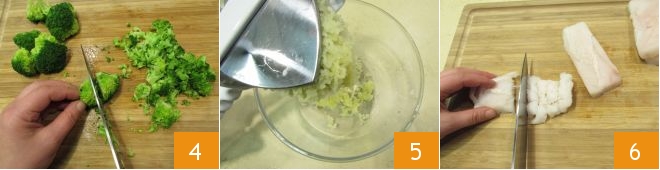 depois pique-os grosseiramente com uma faca 7. Quando os vegetais estiverem frios, pegue a tigela onde amassou as batatas, junte os br f3colis 8 e a merluza picada 9,