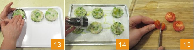 Pegue um pouco da massa e molde com um aro de 6,5 cm de di e2metro para formar os medalh f5es 13: com essas quantidades voc ea deve obter 6 unidades. Transfira os medalh f5es para uma assadeira forrada com papel manteiga, regue com um fio de azeite e acrescente mais uma pitada de pimenta 14; ent e3o asse em forno est e1tico preaquecido a 200 b0C por cerca de 20 minutos. Enquanto os medalh f5es est e3o no forno, passe para a prepara e7 e3o do acompanhamento: lave e corte os tomatinhos ao meio 15;