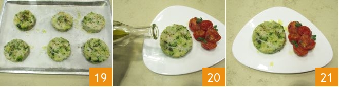 Decorrido o tempo de cozimento dos medalh f5es, retire-os do forno 19 e transfira-os para um prato de servir; coloque ao lado os tomatinhos ainda quentes, adicione algumas folhinhas de manjerona e regue com um fio de azeite cru 20. Seus medalh f5es de merluza e br f3colis est e3o prontos para serem servidos 21!