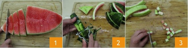 Para preparar a melancia cristalizada, comece pela casca, que deve ser bem limpa da polpa vermelha e depois cortada em tiras 1. Em seguida, descasque a casca, eliminando a parte mais escura, usando um descascador 2. Corte em cubos de cerca de 1 cm e agora você deve repetir essa operação três vezes para que a casca tenha a consistência correta 3.