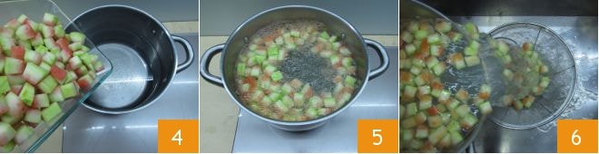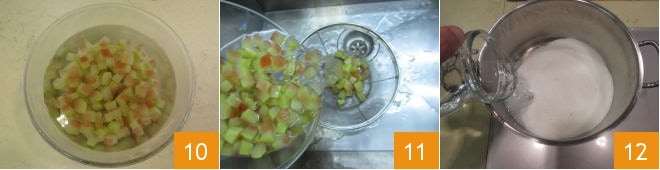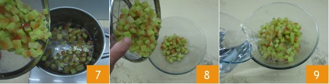 e repita mais 2 vezes 7. Na terceira e última vez, escorra os cubos colocando-os em uma tigela 8 e depois cubra com bastante água fria 9.