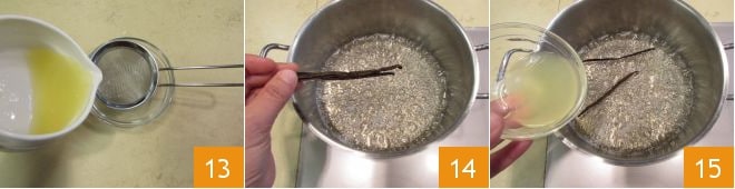 Ligue o fogão e deixe a mistura atingir uma consistência viscosa semelhante à do mel; leva aproximadamente 20/25 minutos. Esprema o limão e coe o suco 13, na panela com a calda adicione a vagem de baunilha dividida 14 e depois o suco coado 15.
