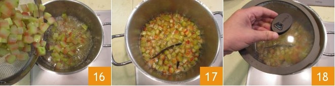 Mergulhe também os cubos de casca 16 e deixe-os cozinhar por cerca de 50 minutos em fogo baixíssimo, mexendo de vez em quando 17. Uma vez cristalizados, desligue o fogo, elimine a espuma superficial, se houver, usando uma escumadeira e depois cubra com a tampa 18.