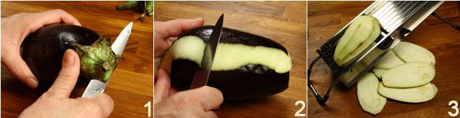 Corte as pontas 1, lave e seque as berinjelas, depois descasque-as 2 e corte-as em fatias com cerca de ½ cm de espessura 3.