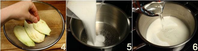 Salpique-as com um pouco de sal grosso 4 e coloque-as para perder a água de vegetação em um escorredor sobre o qual você colocará um prato com um peso por cima. Deixe desta forma por pelo menos uma hora e meia. Enquanto isso, despeje em uma panela 500 g de açúcar 5 e 250 ml de água 6; leve para ferver mexendo, até que o açúcar esteja completamente dissolvido.